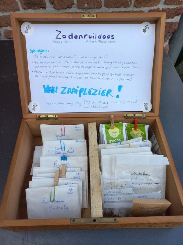 De zadenruildoos is tijdens de meeste activiteiten aanwezig of bij een van de deelnemers. Piet weet waar.
