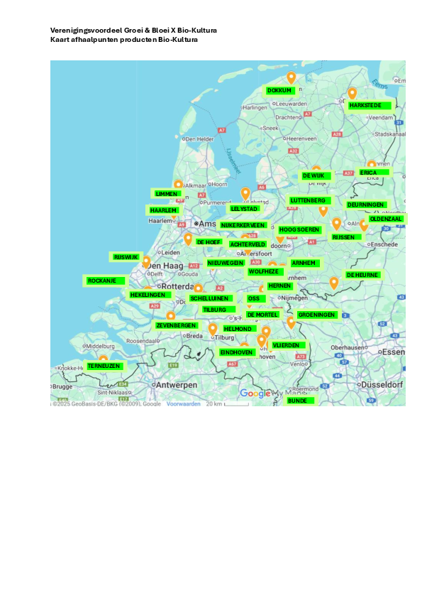 Vanaf maandag 24 november 2025 kunnen leden hun bestelling plaatsen in de webshop van Groei & Bloei en kiezen uit één van de 33 afhaalpunten in het land, zie kaart onder aan deze bladzijde. In februari 2026 kunnen de bestellingen daar opgehaald worden. Ook in ons eigen woongebied (Nijkerkerveen) is een afhaalpunt, bij Jacques en Sandra van de Belt, Amersfoortseweg 45.